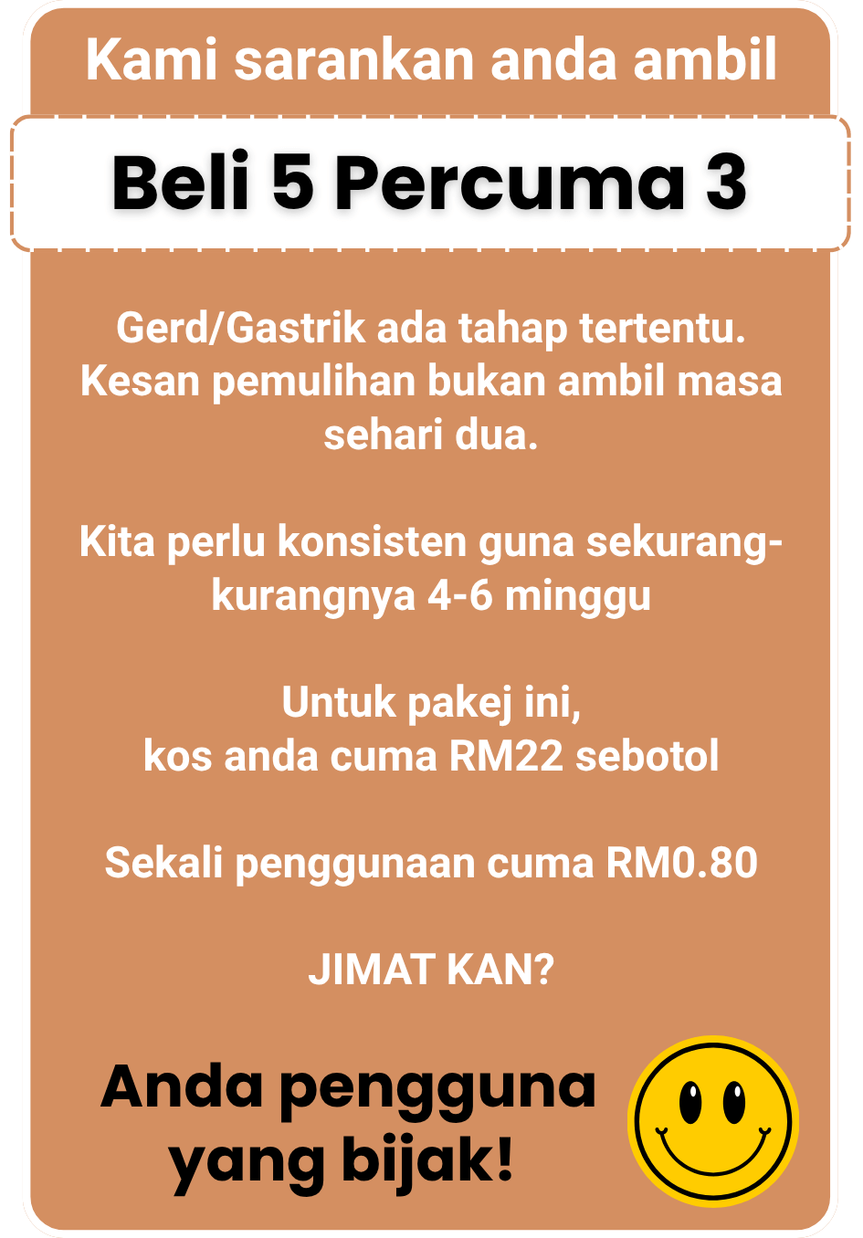 Gerd/Gastrik ni ada tahap-tahap dia. Kami sarankan guna minimum 4 minggu untuk kesan optimum. Bukan magic, tapi berkesan bila konsisten. Insyallah